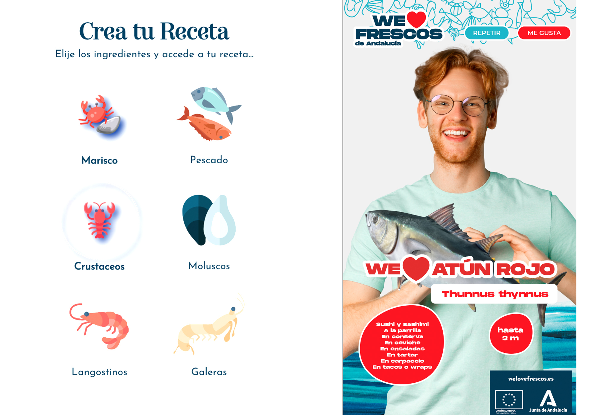 En el Área Expositiva podrás participar a través de actividades dinámicas, como nuestro tótem interactivo,... con el que podréis conocer con detalle la calidad de los productos pesqueros y acuícolas andaluces e, incluso, fotografiaros con ellos. También podréis interactuar creando vuestra propia receta, a través de nuestro WE LOVE TU RECETARIO. Todo ello en constante relación con las actividades que ocurran en el escenario Aula del Mar.
